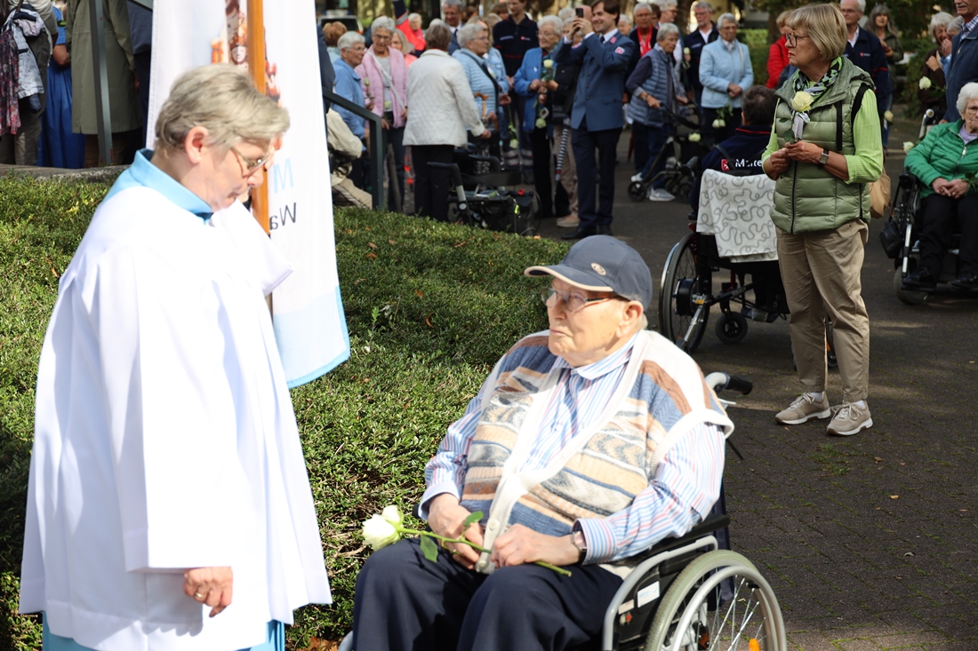 Gestärkt kehrten die Wallfahrerinnen und Wallfahrer in einer festlichen Prozession, begleitet von Gebeten und Liedern, zur Basilika zurück. Vor dem Gnadenbild der „Trösterin der Betrübten“ legten sie weiße Rosen nieder – ein stilles Zeichen der Verbundenheit mit Maria.