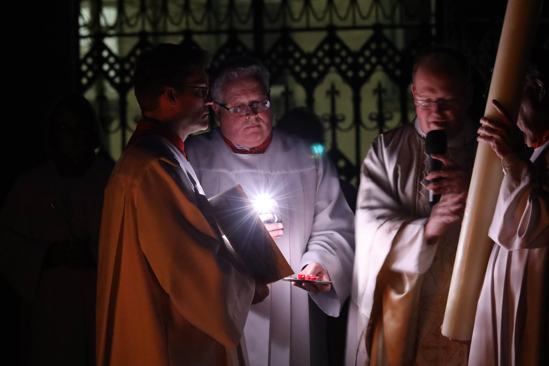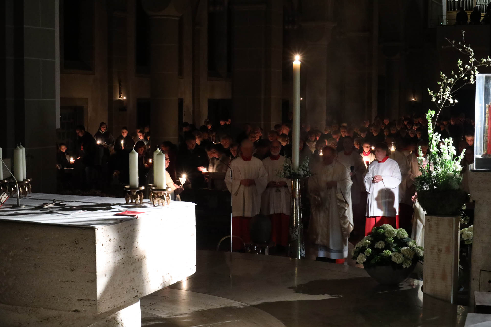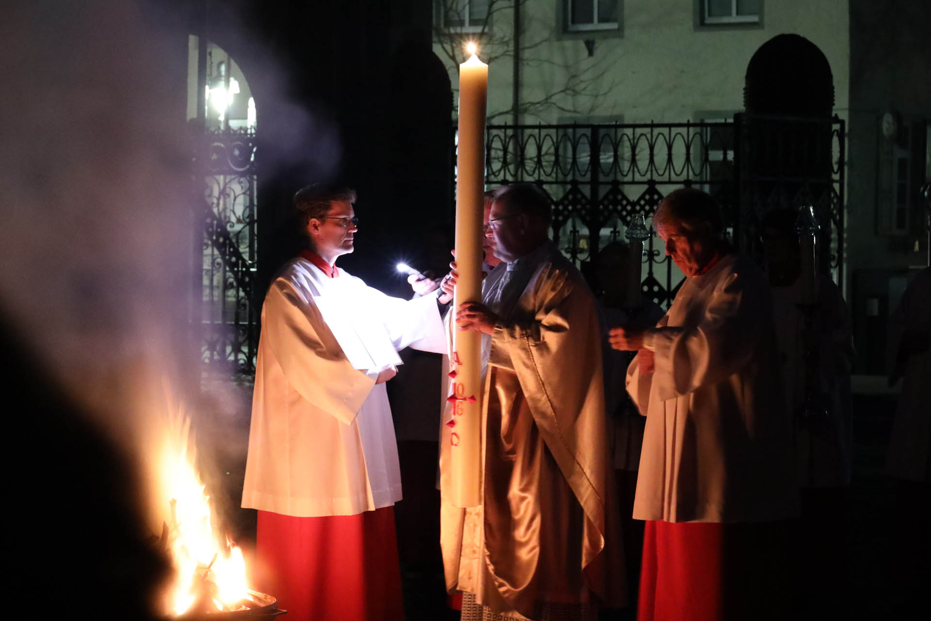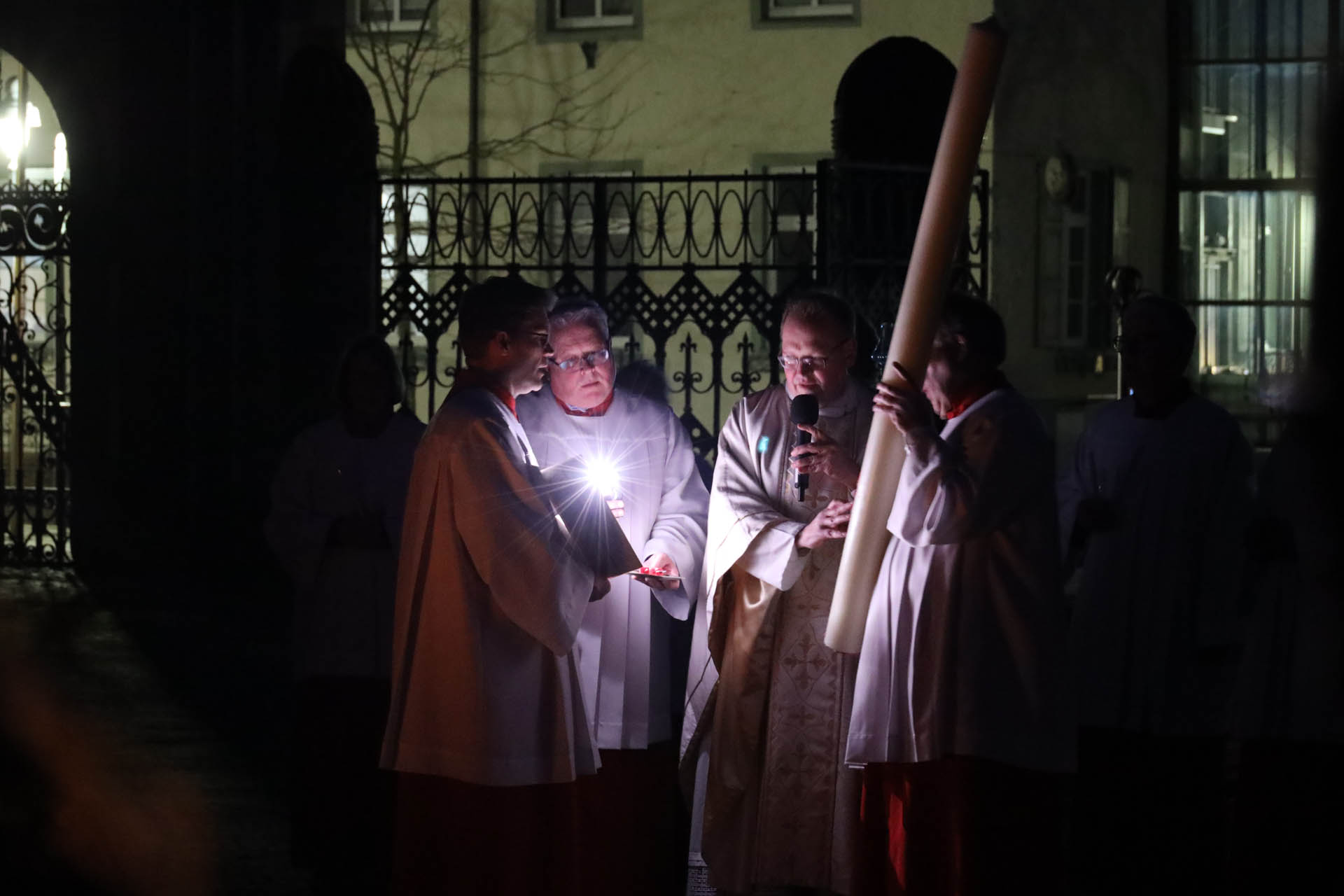 Den Höhepunkt des Triduums bildete die Osternacht am 4. April. Auf dem Vorplatz der Basilika wurde das Osterfeuer entzündet und die neue Osterkerze gesegnet. Beim Einzug in die dunkle Kirche verbreitete sich ihr Licht im ganzen Raum, als die Gläubigen ihre Kerzen daran entzündeten.