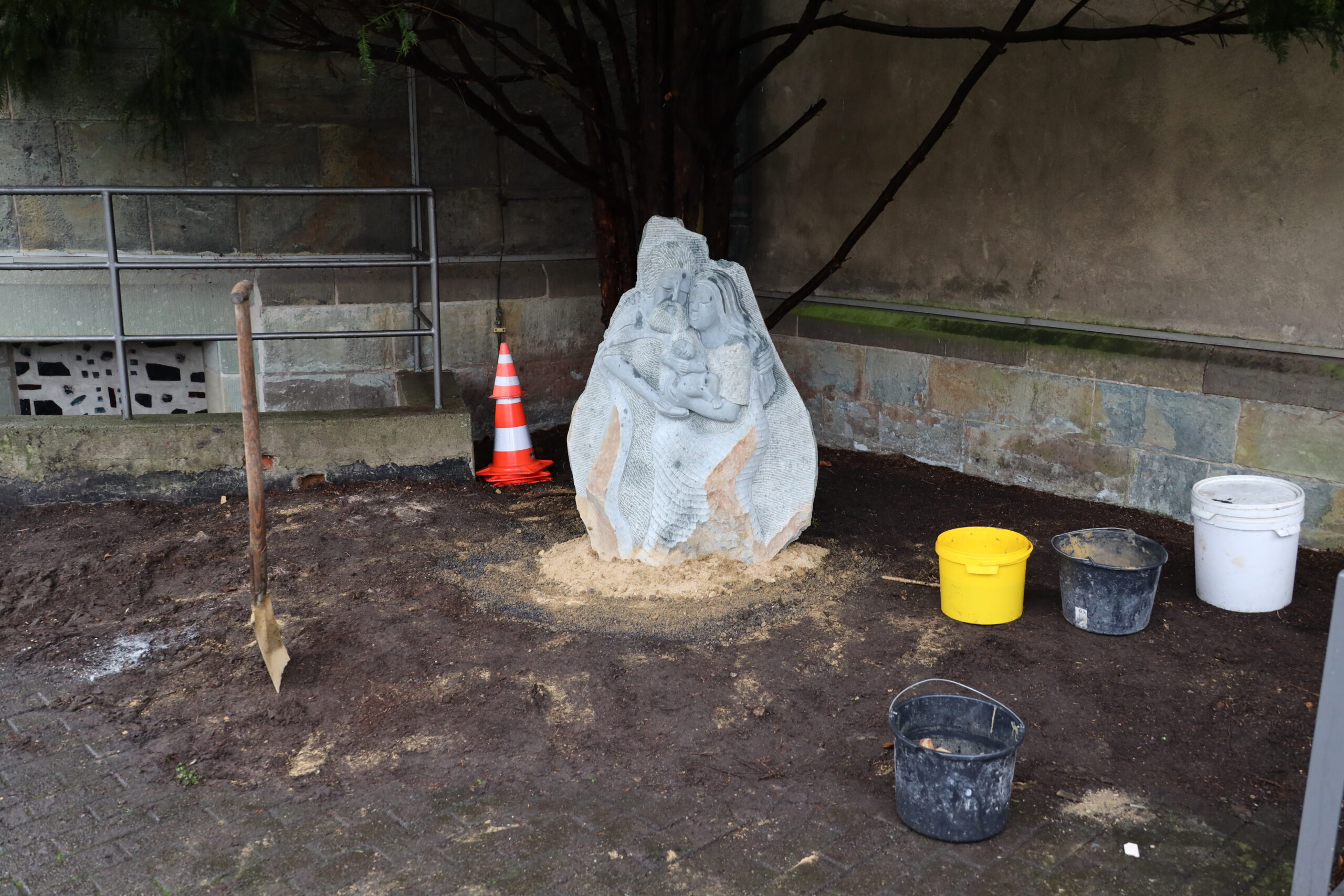 Der Stein wurde vor Ort durch die Firma Sobbe fachgerecht gesetzt. Die Fläche rund um die Skulptur wird in den kommenden Wochen gärtnerisch gestaltet und bepflanzt, sodass sich die Arbeit harmonisch in den Klostergarten einfügt.