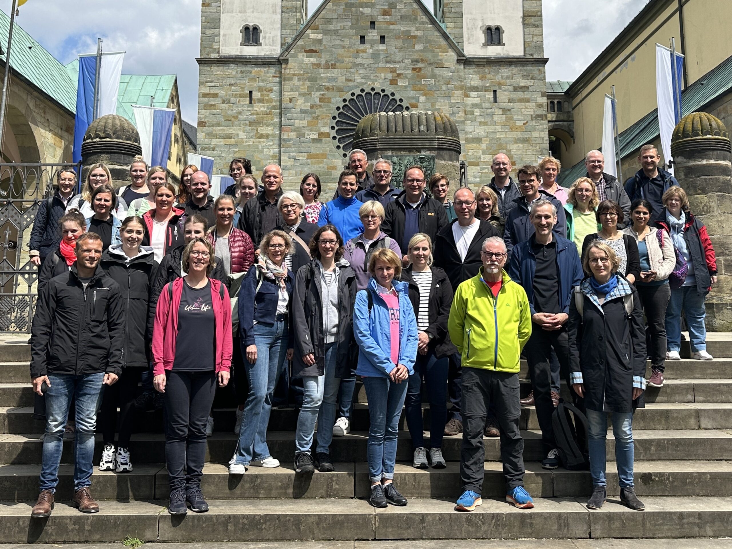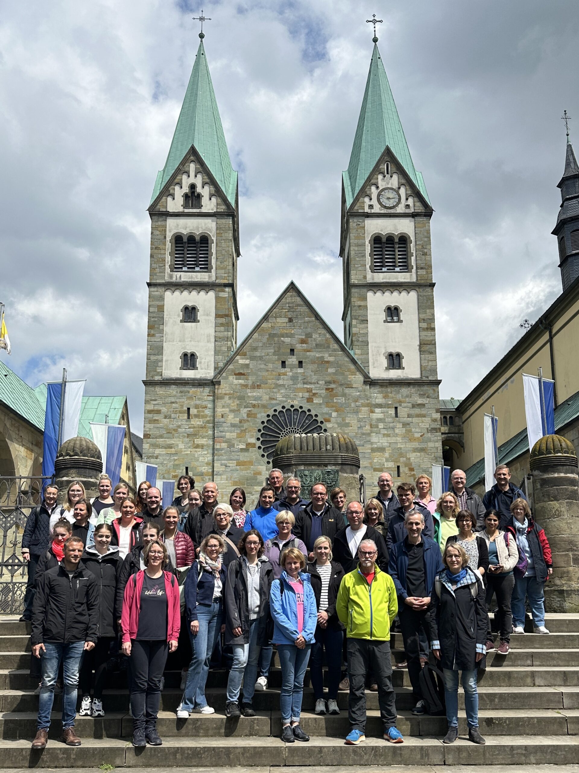 Auf dem Vorplatz angekommen, wurde die große Gruppe vom Glockengeläut der Basilika empfangen und stärkte sich im Anschluss mit einem kleinen Imbiss im Pilgersaal.