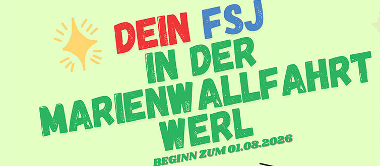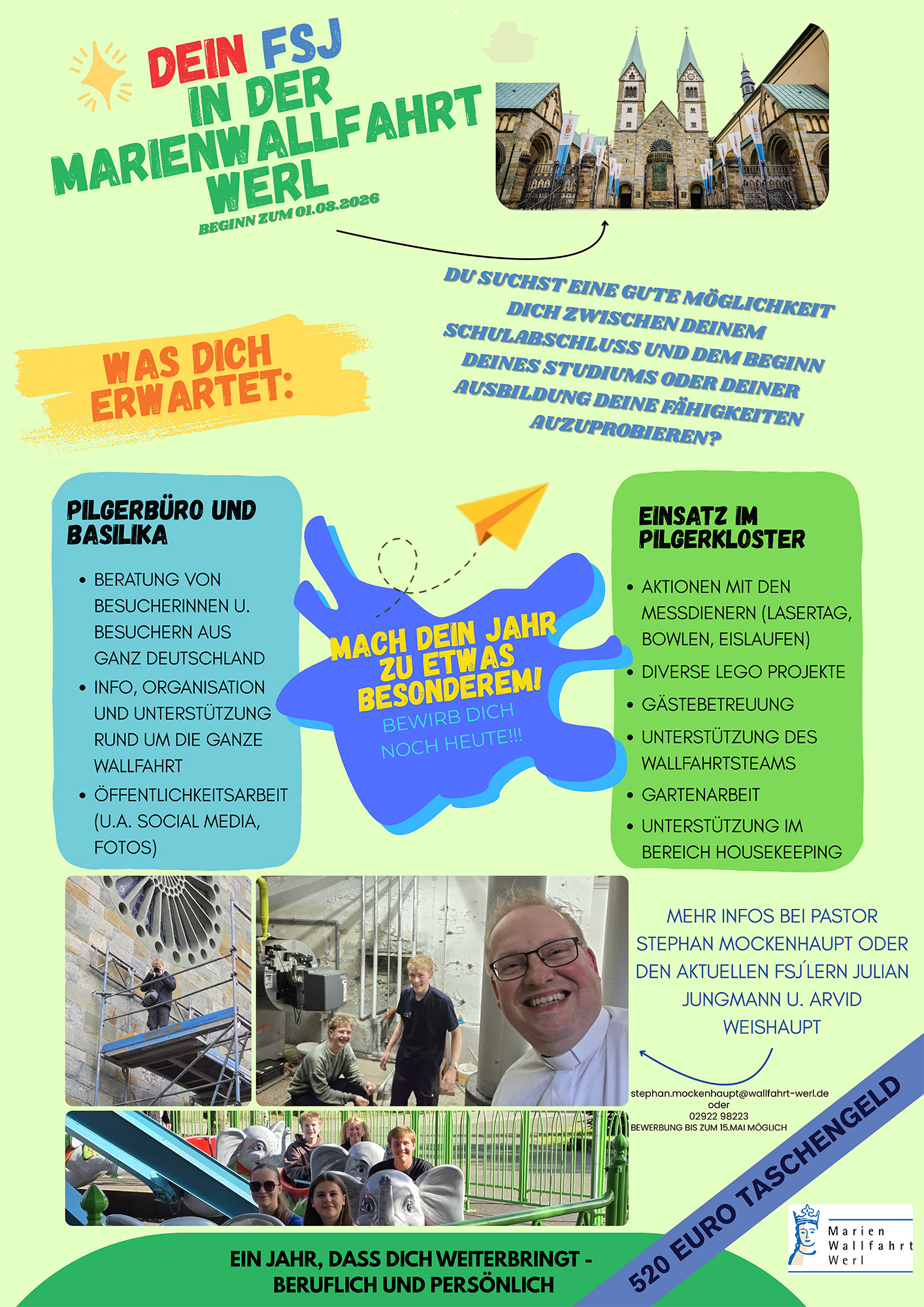 Für nähere Informationen stehen Pastor Stephan Mockenhaupt oder unsere aktuellen FSJ’ler, Julian Jungmann und Arvid Weishaupt, zur Verfügung. Bewerbungen werden erbeten bis zum 15. Mai 2026 an Marienwallfahrt Werl, Pastor Stephan Mockenhaupt, Steinergraben 53, 59457 Werl.