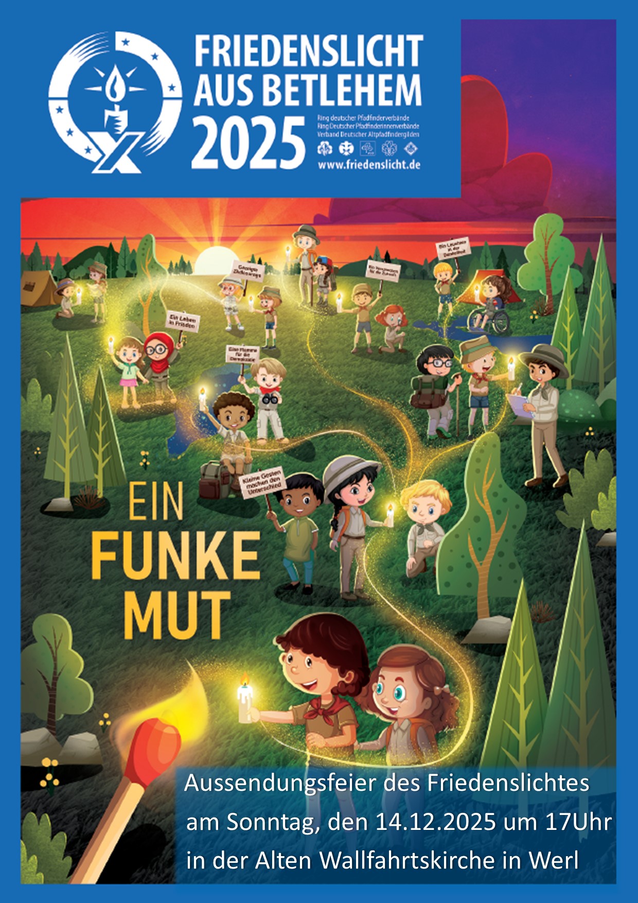 Am Sonntag, den 14.12.2025 um 17 Uhr wird in der Alten Wallfahrtskirche Werl das Friedenslicht aus Betlehem ausgesendet. Unter dem Motto „Ein Funke Mut“ sind alle herzlich eingeladen, das Licht des Friedens zu empfangen und weiterzutragen.
