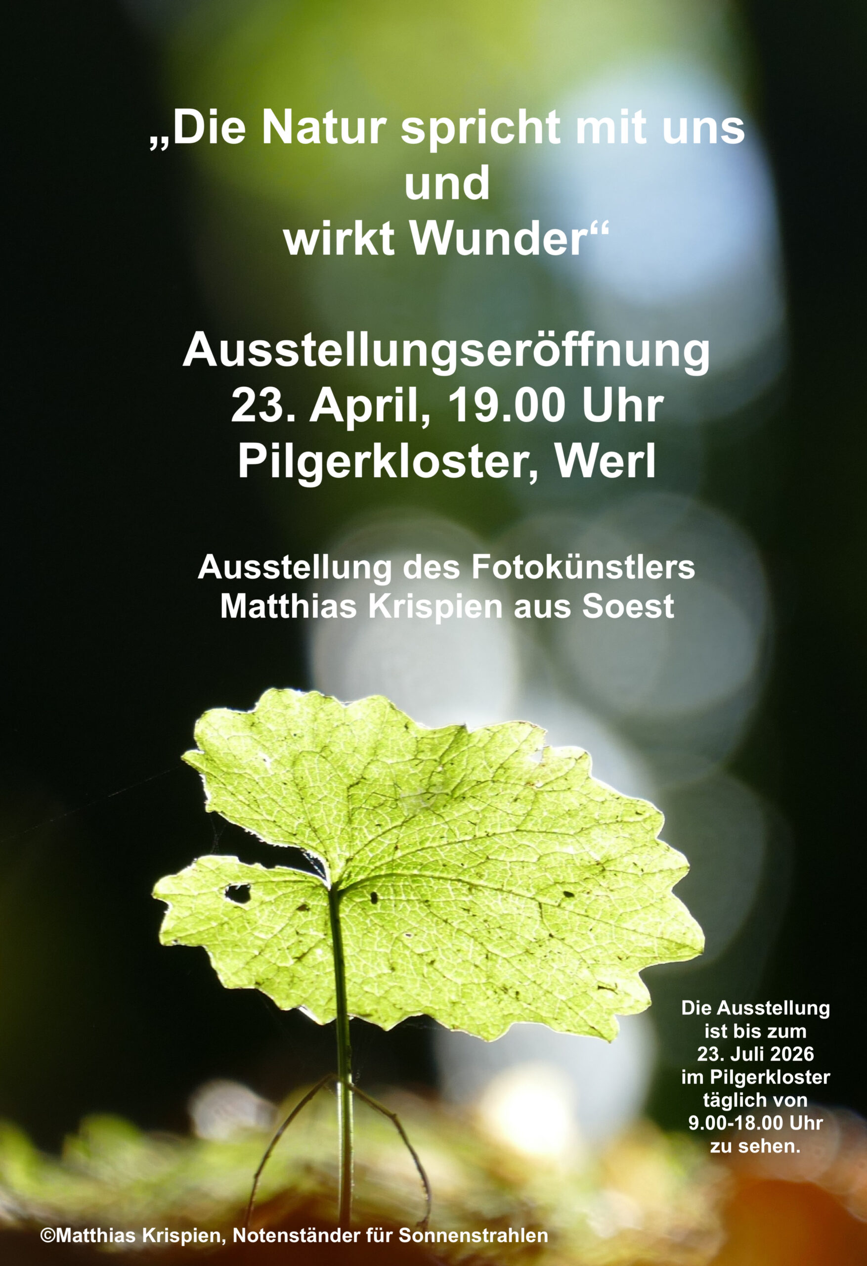So beschreibt der Soester Fotograf Matthias Krispien seine Ausstellung mit zum Teil auch international prämierten Fotos. Seine Arbeiten öffnen den Blick für die Schöpfung, für die feinen Linien zwischen Mensch und Natur – und für das, was beide miteinander verbindet. Viele der Aufnahmen sind auf jenen Wegen entstanden, die Pilgerinnen und Pilger nach Werl führen. Sie erzählen von Aufbruch, Unterwegssein und Ankommen.